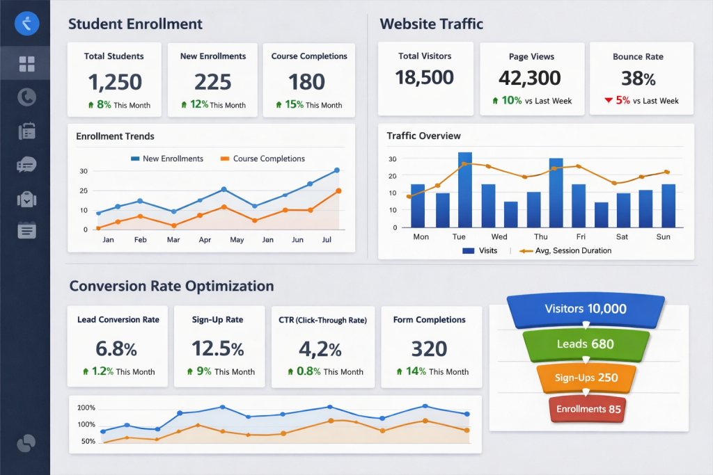 Optimize your website and landing pages to improve conversion rates and turn prospects into enrolled students.